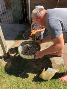 It then became a whole family project this afternoon. The gravel needed washing and with it being such a hot day, specially in our suntrap back garden, I knew a quick hose down and laying it out on the drive would mean I could make these this evening. Husband and four year old got to work finding a giant sieve thing from the garage and hosing the gravel through the sieve. I then found some old weird fabric I have no use for and laid it out on the drive. It only took an hour or so to dry completely, so pulled the fabric around the gravel and lifted it into a carrier bag so I could take it up to my sewing room.