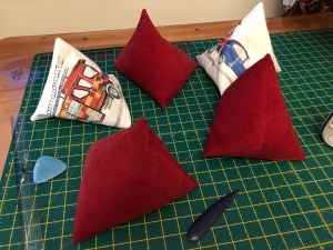 The sewing element is completely straightforward, then I found a piece of card and a big serving spoon from the kitchen, to funnel the gravel into the opening. I filled it quite full so I tried to machine sew the opening shut but only got so far, so a little spot of mindful hand sewing and I was done.
