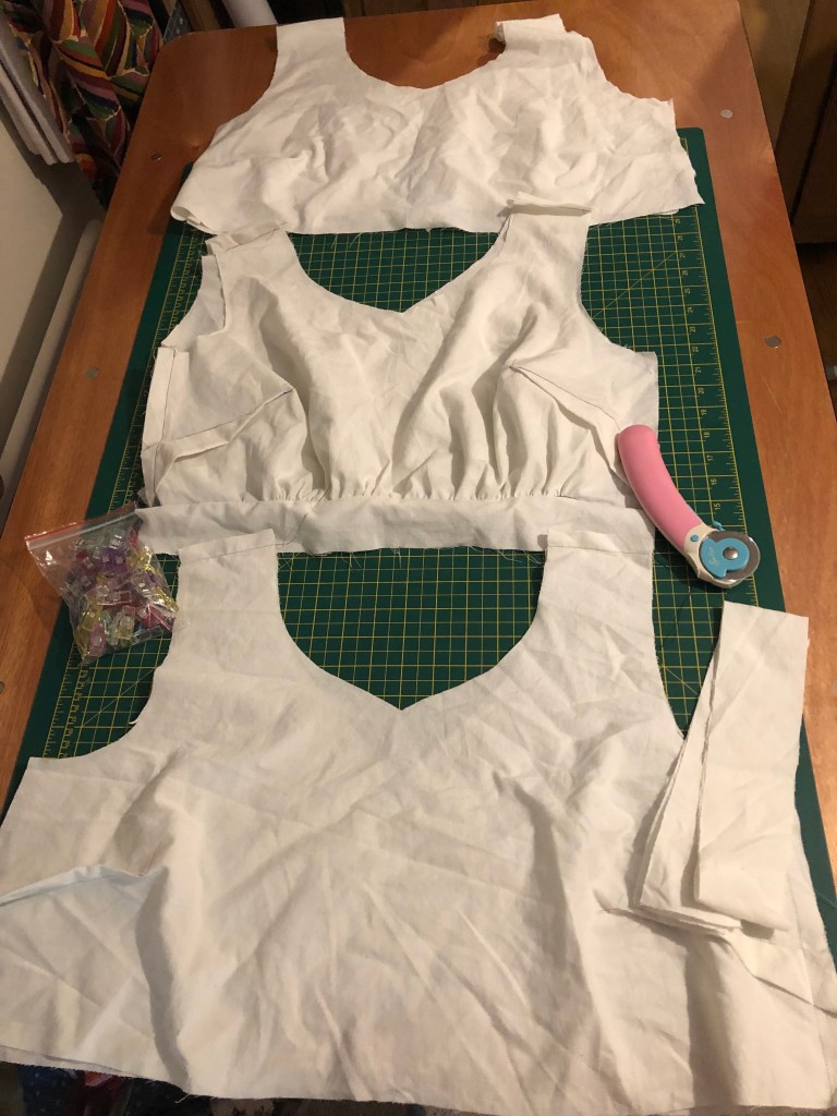 I’m not very confident I got a great fit even with this adjustment. I felt the waistband that for the size I chose is the right size. One of these toiles is the size down and that was too snug for comfort. Then once I didn’t have flattened down boobs at the front, I was actually left feeling it was slightly wide around the sides. I’m wishing I’d gone on the Elisalex Bodice Fitting Workshop that Sarah held in her shop recently. I could have learned more about what to do to get it just right. But it’s not too billowy, so I’m letting it go.