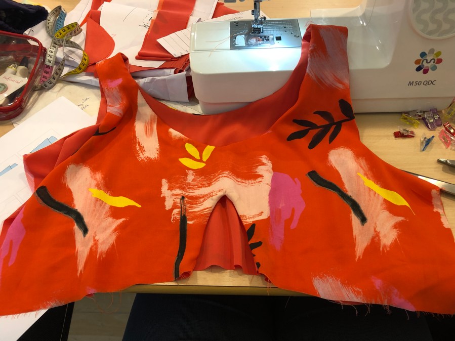 – If you’re using drapey slippery fabric like I was, turning this burrito through is an absolute dream. Pull the right hand side through the tunnel of the left hand shoulder. The left hand armscye and neckline will now be right sides out with seams all fitted inside and looking lovely and neat. Press this flat to check it’s all looking nice;