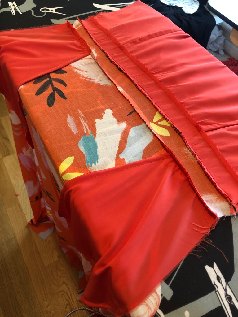 So next was attaching the bodice, waistband and skirt panels all together. In the photo below, the centre seam of these three is where the bodice is attached. But you can’t see the bodice because from there I attached a main fabric waistband plus a lining waistband. Then from those, I attached the skirt panels. The lining skirt panels are what you see hanging off the right hand part of the ironing board, and the main fabric skirt panels hanging off the left. Then I followed the instructions to join the waistband pieces and stitch along to hold the two together.