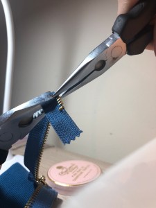 I love Tilly instructions when it comes to something like inserting a zip. She just seems to make sense and you feel so comfortable doing it. I had an instruction booklet with an “oops” note left in, saying they were changing the order of making the zip area, but it was absolutely fine to do. I had to shorten my zip, because it calls for quite a short zip and finding one that same colour was a challenge. But all you do is pull off some teeth with some pointy-nosed pliers, while holding the zip in some chunky pliers in your other hand, and you’re safe to sew across the zip to do the waistband.