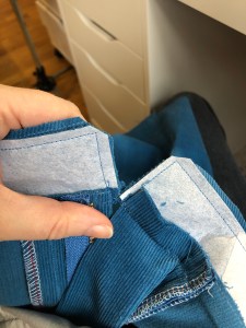 I did have one thing flummox me and I’ve been told by my Insta friends that a few people have had the same thing. So the instructions say that if you match up the notches on the interfaced waistband, then you should have a nice even 5/8″ of extra overlap at each end of the waistband, beyond the yoke panel you’re attaching to. Well! Whichever way I tried to line anything up, I couldn’t get it to give me an extra amount of waistband of more than about a quarter of an inch. I put it down for the night and had some sleep, while I waited for comments to come through on Instagram to help support me.