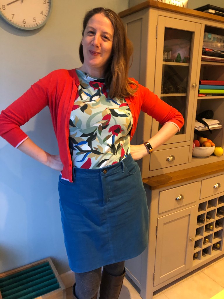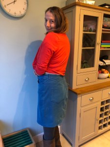 I found the sizing surprisingly generous, but Sarah found hers was more forgiving in a cord than with a denim, so maybe factor that in when working with cord. I had originally, just going by the instructions, graded from a size 6 waist to a 7 hip. I really didn’t need to and this was me bringing it back in when fitting the skirt on later. Once I got to the right kind of hip hugging shape, I clipped the curve and overlocked the rest of this away.